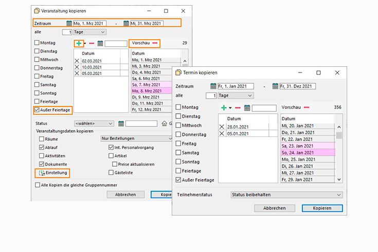 Das Arbeiten mit vielen oder einzelnen Datensätzen ist noch leichter geworden: der neue Kopierdialog für Serientermine oder wiederkehrende Veranstaltungen bietet einen schnellen Weg zur Vervielfältigung von Daten, und die Verknüpfung von Informationen miteinander wird noch besser unterstützt. Vor allem bei der Bearbeitung von großen Datenmengen fällt außerdem die gesteigerte Verarbeitungsgeschwindigkeit auf.